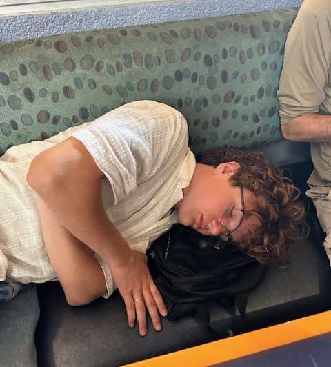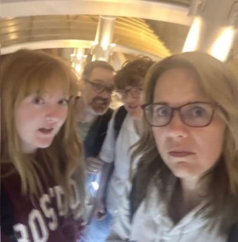 Sam got a stuffie outside the park while we were doing our thing and then we took a tired selfie up the escalator.
