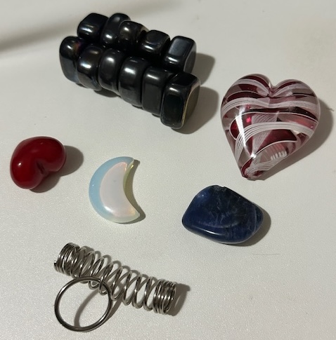 The small red heart was part of a gift from something from Etsy in the last two years. It was a “gift with purchase” and this little tiny heart just fits in three fingers so perfectly. It sometimes slips out of my grasp but it’s tiny, and the crease in the heart has a little indent in it that feels just weird enough when I’m talking on the phone and need something to distract myself with.